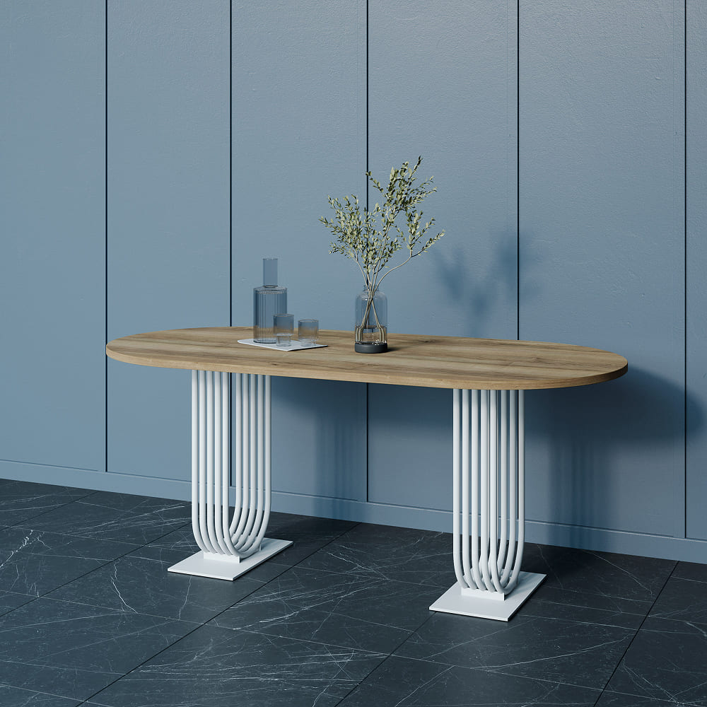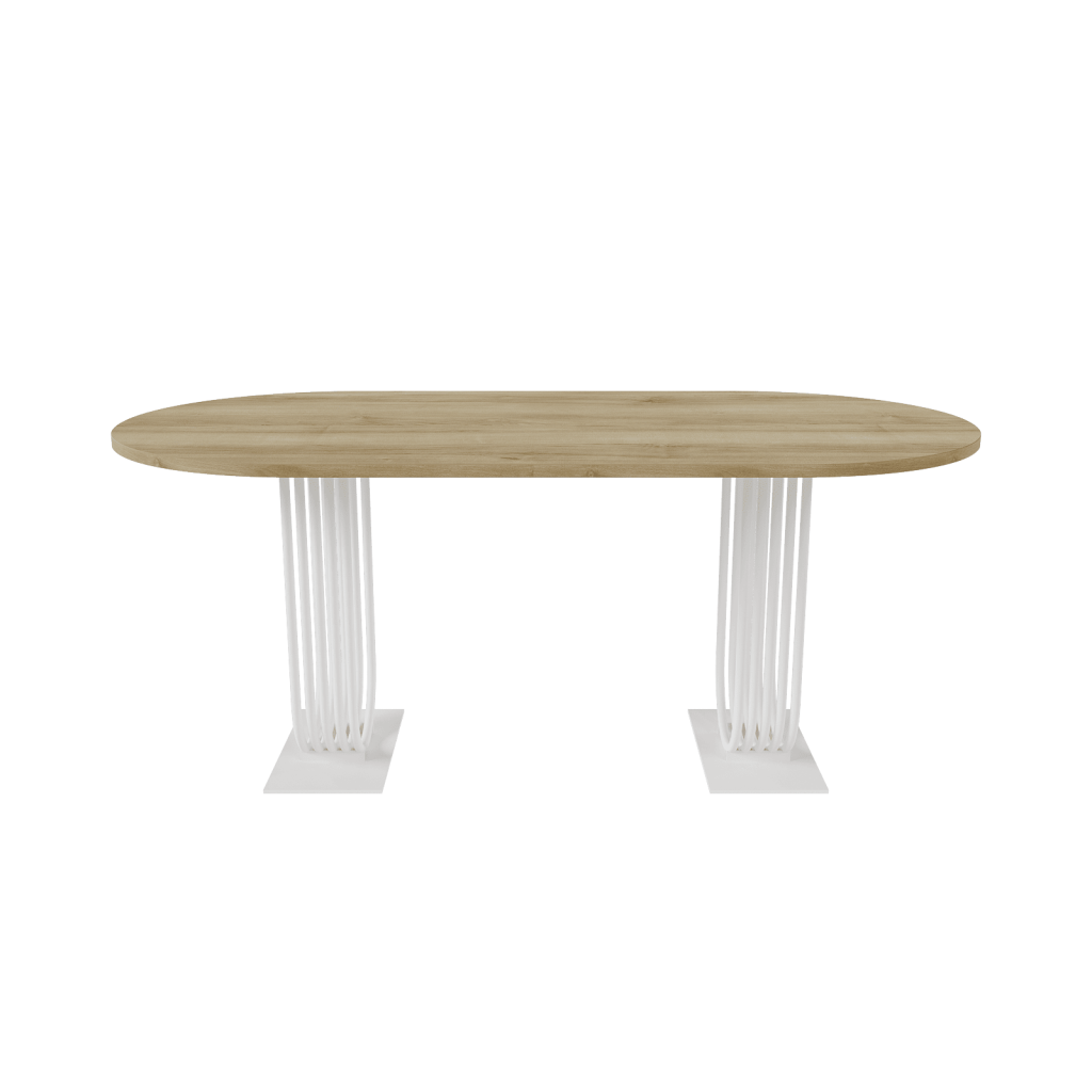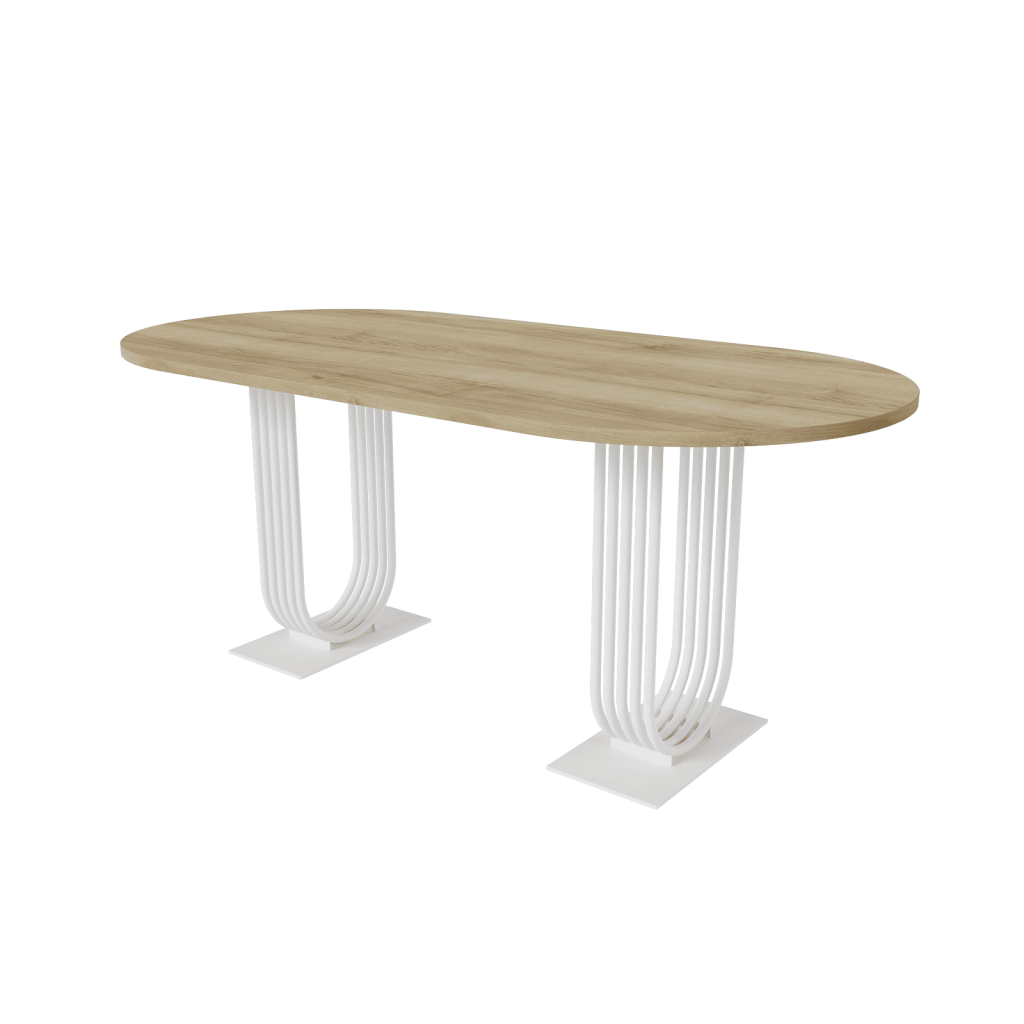 Лаконичный внешний вид овального стола серии ARFEO Duo, основанный на строгих прямых линиях, обеспечивает универсальность, позволяя органично вписаться в любой интерьер – от уютной домашней кухни до современного офисного пространства. Столешница, изготовленная из высококачественного ЛДСП толщиной 2.5 см, отличается не только прочностью и долговечностью, но и приятной на ощупь текстурой. Основа стола – прочный металлический каркас, выполненный из трубы диаметром 2 см. Такая конструкция гарантирует не только впечатляющую несущую способность, позволяющую комфортно разместить за столом от 4 до 6 человек, но и неповторимый индустриальный шарм. Обработка металла – это высококачественная матовая порошковая покраска, доступная в трех классических цветах: золотом, черном и белом. Порошковое покрытие не только обеспечивает привлекательный внешний вид, но и защищает металл от коррозии и механических повреждений, гарантируя долгий срок службы изделия.