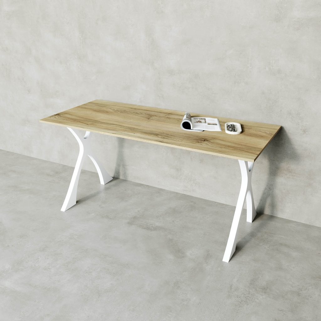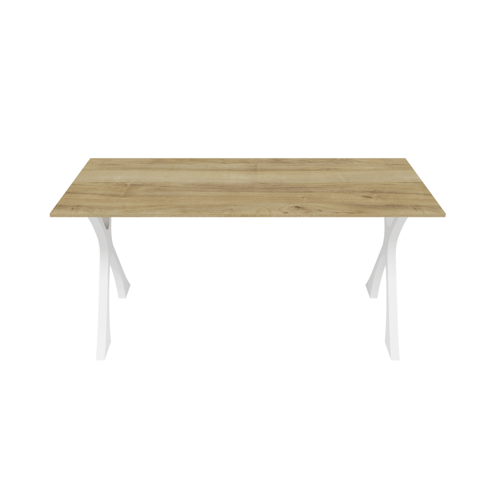 Ключевой элемент дизайна — изящное X-образное подстолье, его строгие прямые линии создают ощущение современности и элегантности. Стандартный вариант – золотое, черное и белое матовое покрытие, придающее столу лаконичный и стильный вид, идеально подходящий для минималистичных и современных интерьеров. Столешница ЛДСП премиального качества цвета орех толщиной 1.6 см, которая гарантирует устойчивость стола к повседневным нагрузкам, а также придает ему солидный и основательный вид.