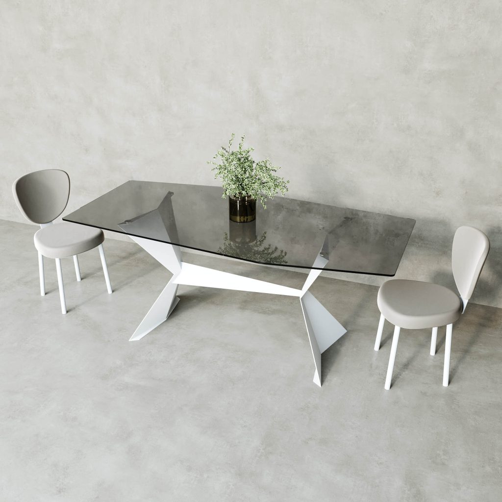 Ключевой элемент дизайна — изящное подстолье нестандартной формы, его строгие прямые линии создают ощущение современности и элегантности. Стандартный вариант – золотое, черное и белое матовое покрытие, придающее столу лаконичный и стильный вид, идеально подходящий для минималистичных и современных интерьеров. Столешница из тонированного закалённого стекла толщиной 1 cм.