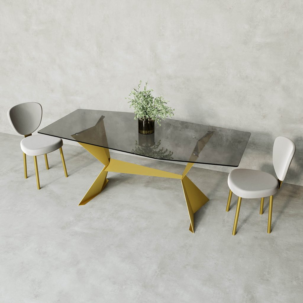 Ключевой элемент дизайна — изящное подстолье нестандартной формы, его строгие прямые линии создают ощущение современности и элегантности. Стандартный вариант – золотое, черное и белое матовое покрытие, придающее столу лаконичный и стильный вид, идеально подходящий для минималистичных и современных интерьеров. Столешница из тонированного закалённого стекла толщиной 1 cм.