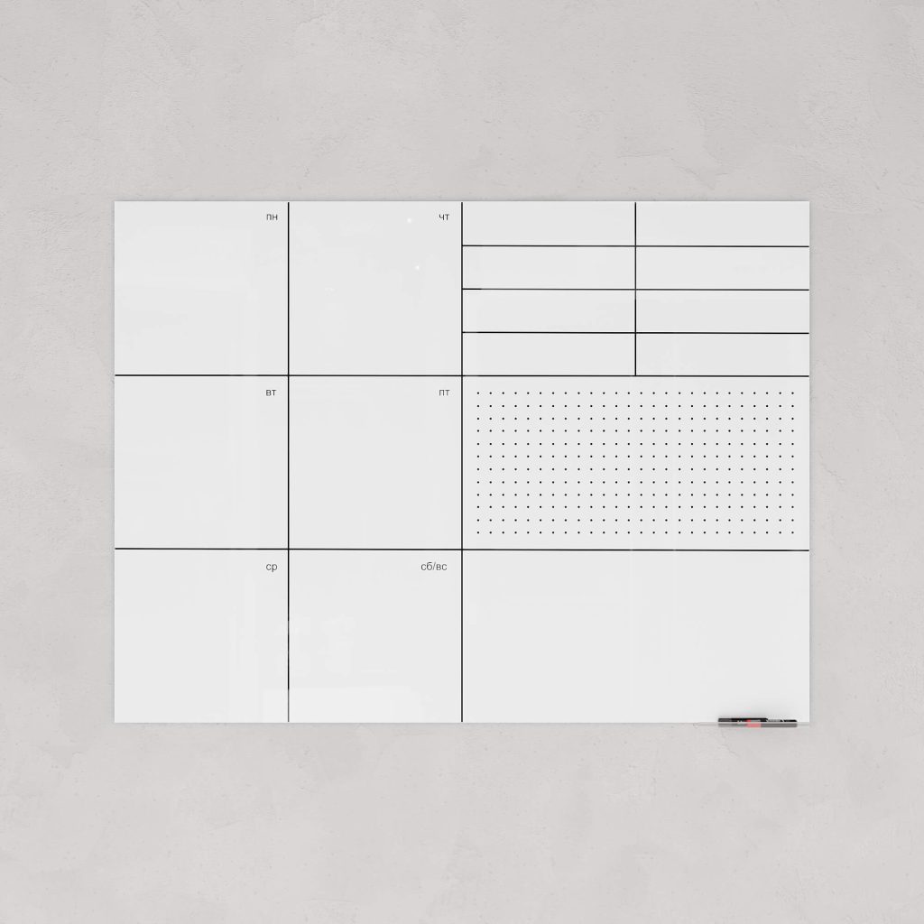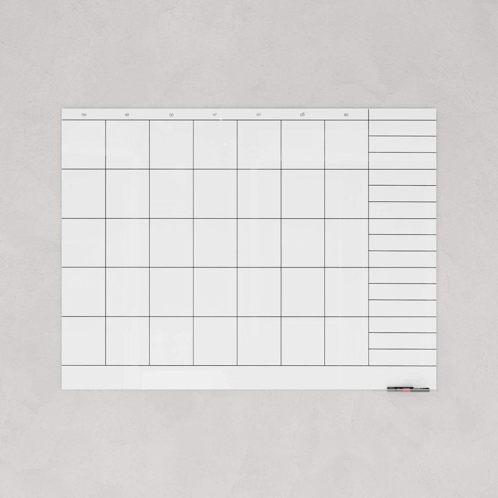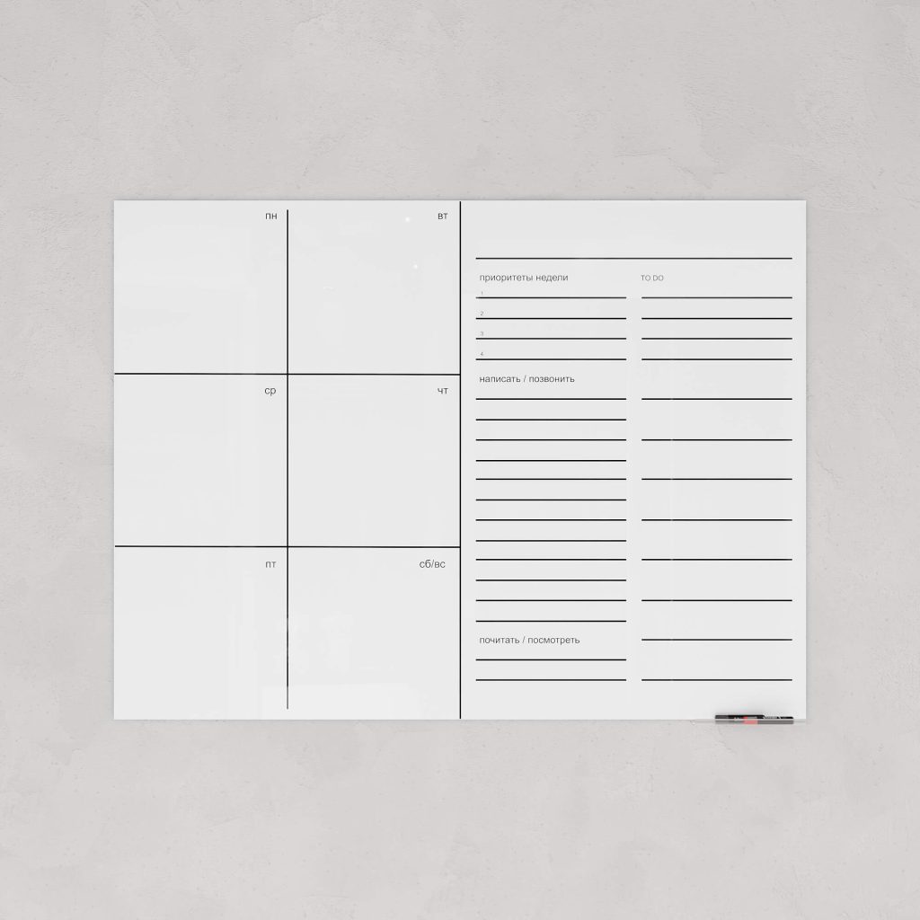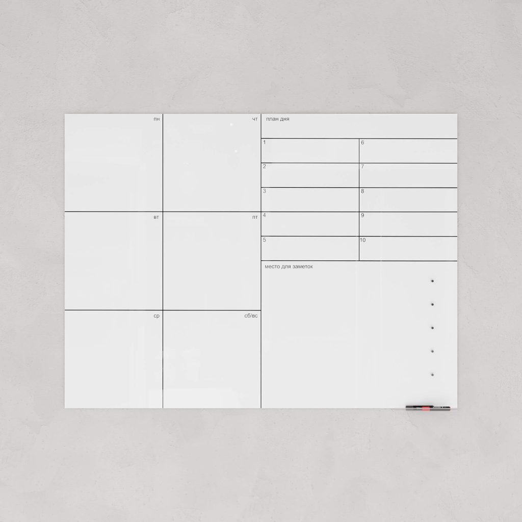 Магнитно-маркерный настенный планер из осветлённого закалённого стекла, размером 90*120 см, с нанесением индивидуального дизайна или рисунка. Стеклянная доска планер изготавливается из самого качественного и прочного стекла, что делает её абсолютно безопасной при перевозке и в использовании. Подходит как для дома, так и для офиса.