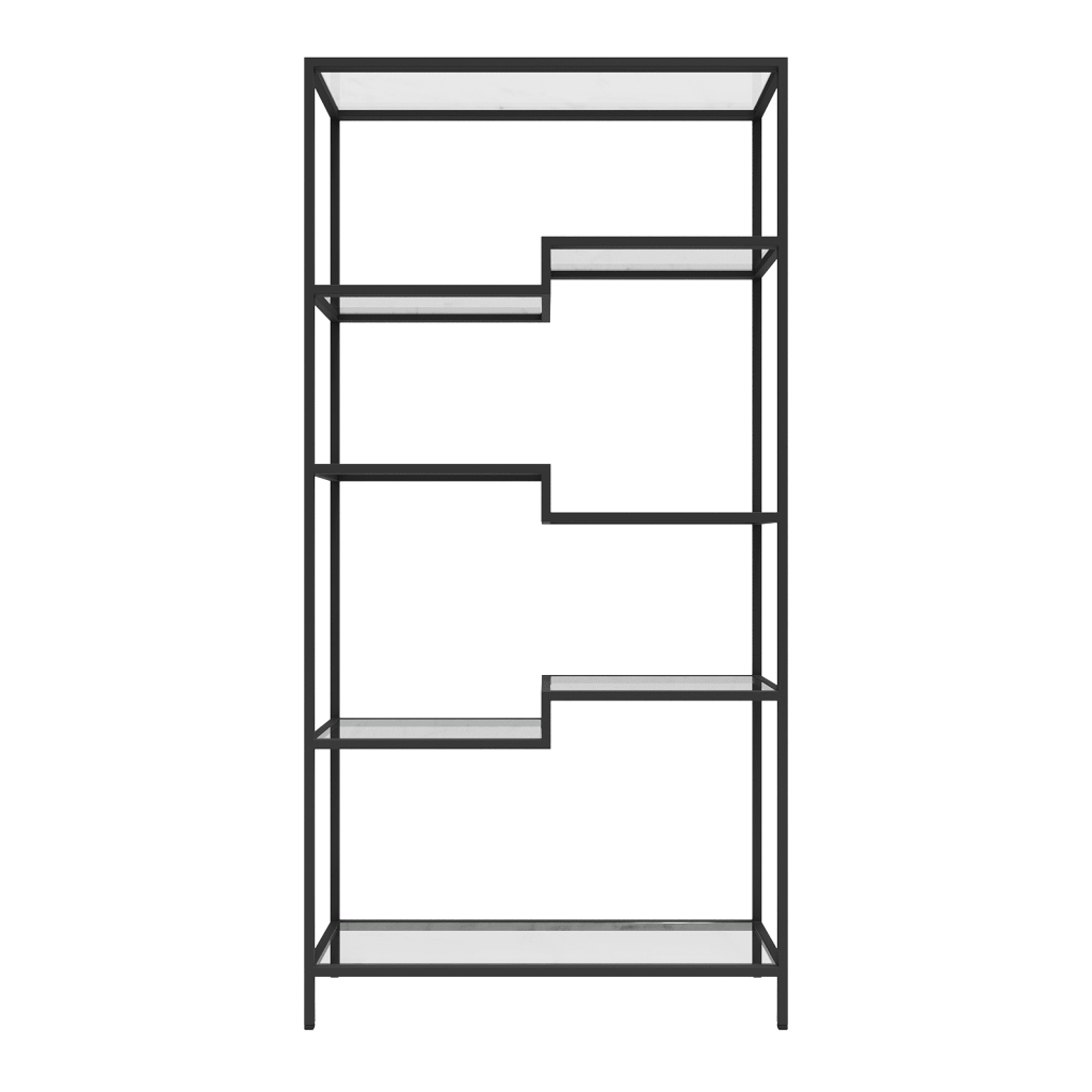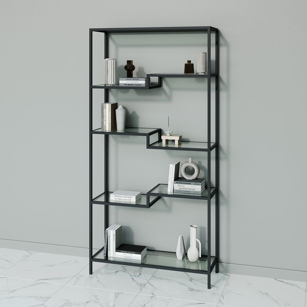Металлический каркас имеет дизайнерскую форму и отлично подходит для расположения абсолютно любых предметов интерьера, например – растения, книги, декор или различны аксессуары. Стеклянные полки добавляют лёгкости, позволяя разместить стеллаж в любом интерьере.