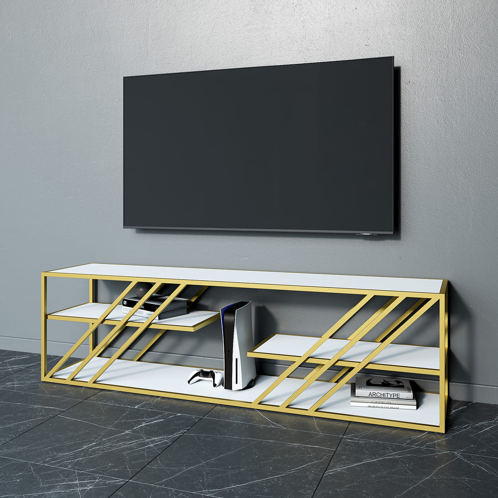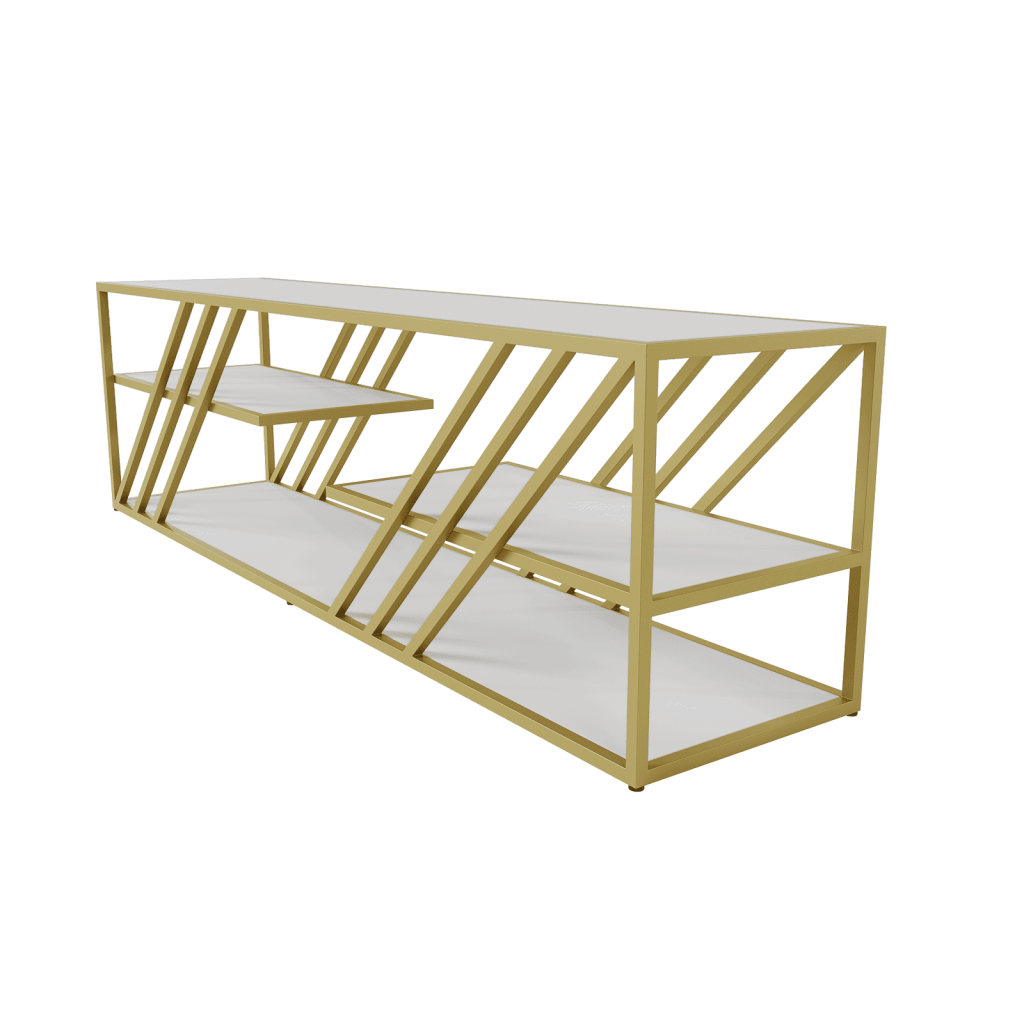 Ее привлекательность сочетает внешний вид и высокое качество материалов: металлическое подстолье, покрытое двойным слоем порошковой краски, защищающей от коррозии и повреждений, обеспечивая гладкость и износостойкость. Цветовая гамма — золото, чёрный и белый — легко гармонирует с любым стилем. Полки из высококачественного ЛДСП толщиной 1,6 см прочные и долговечные, выдерживают значительную нагрузку и придают тумбе солидный вид.