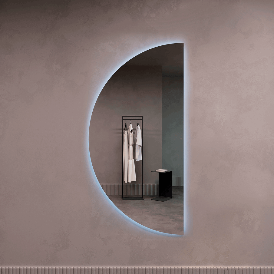 RONTUS NF LED XL – это уникальное безрамное зеркало в форме полукруга с контурной холодной подсветкой, созданное с применением передовых технологий. Оно обладает изысканным дизайном и функциональностью, которые подчеркнут уникальность вашего интерьера и придадут ему особый шарм.