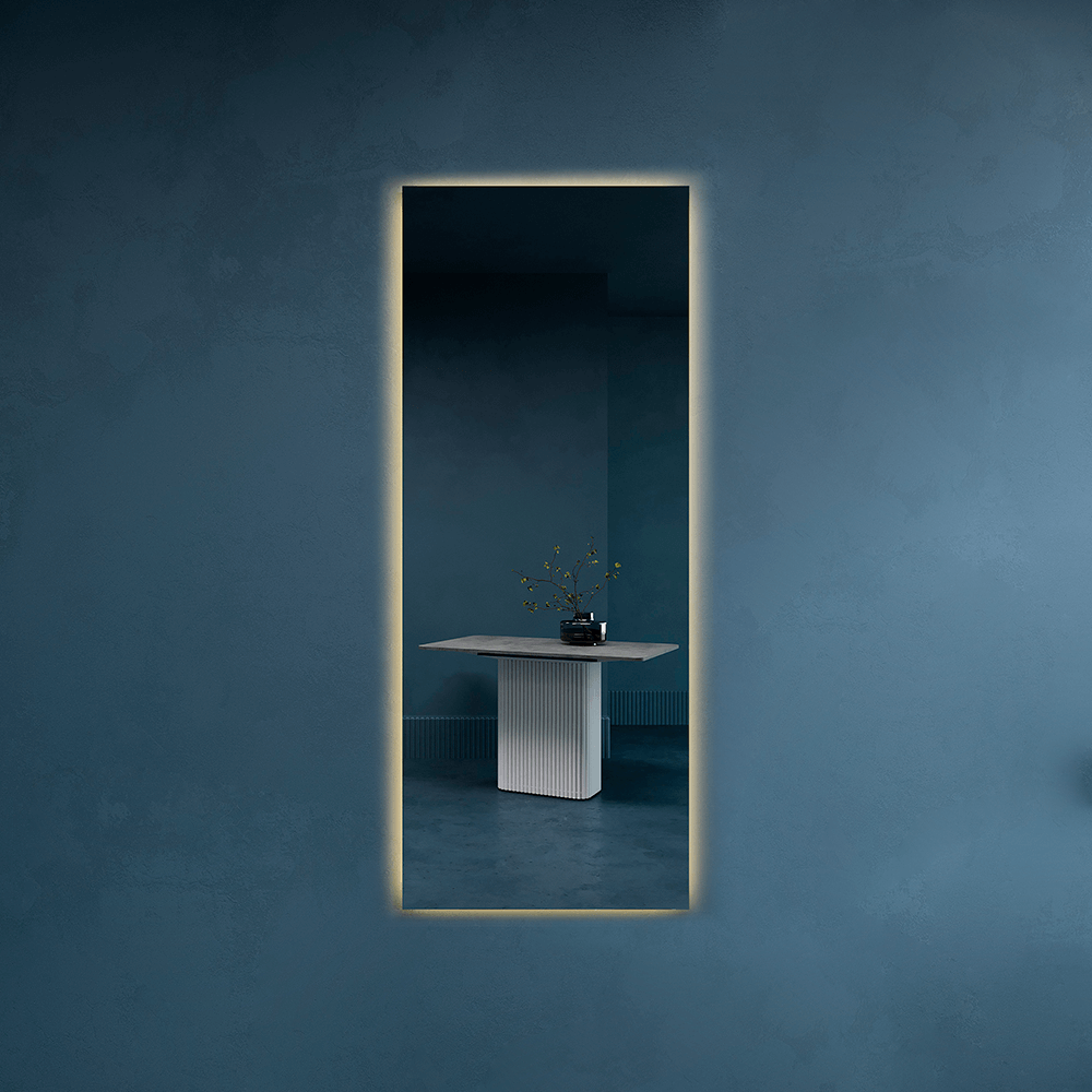 HALFEO NF LED XL Slim— это безрамное зеркало прямоугольной формы с контурной (тыльной) тёплой подсветкой. Это современное зеркало обладает не только изысканным дизайном, но и функциональностью, которая сделает вашу жизнь более комфортной. Есть вывод 220W для подключения к сети (блок питания подсветки 12V), включение подсветки через провод от розетки. Возможно установить сенсорную кнопку на заказ в любом месте зеркала за дополнительную стоимость.