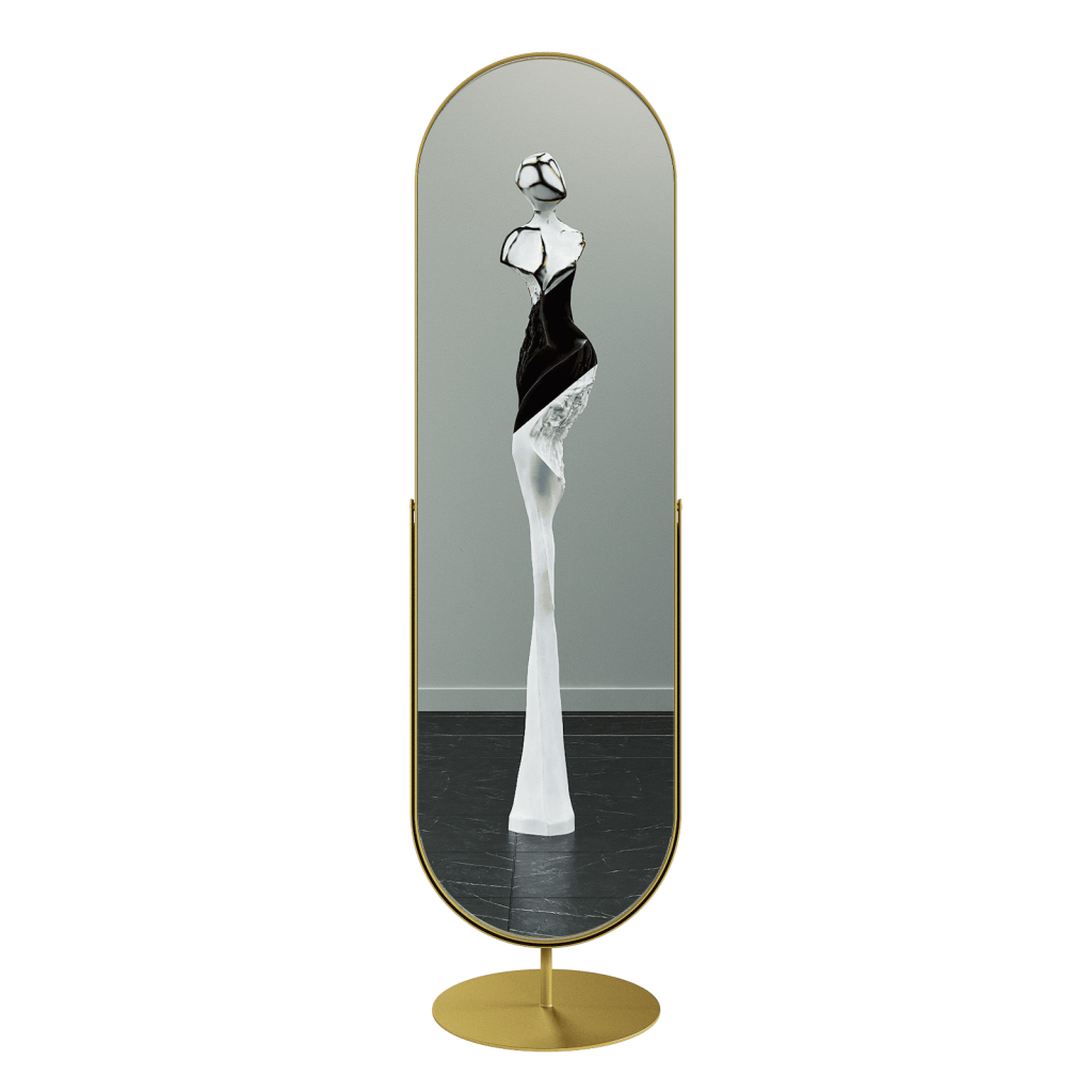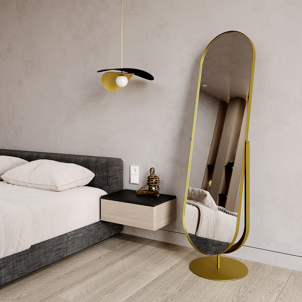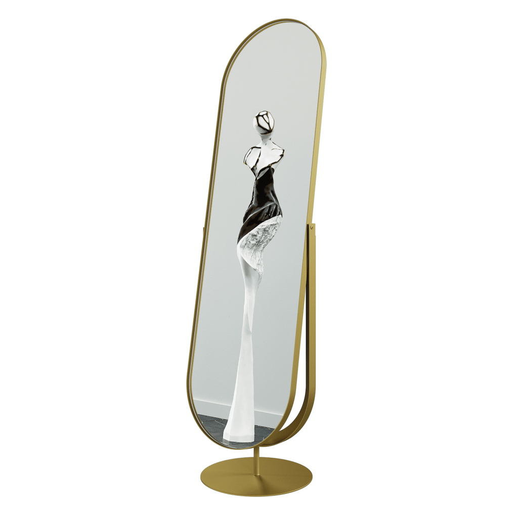 Зеркало в раме овальной формы OZEVIS – это воплощение элегантности и функциональности. Это поворотное зеркало в пол в дизайнерской металлической раме, выполненной вручную. Габаритные размеры зеркала составляют 165 х 46 см.