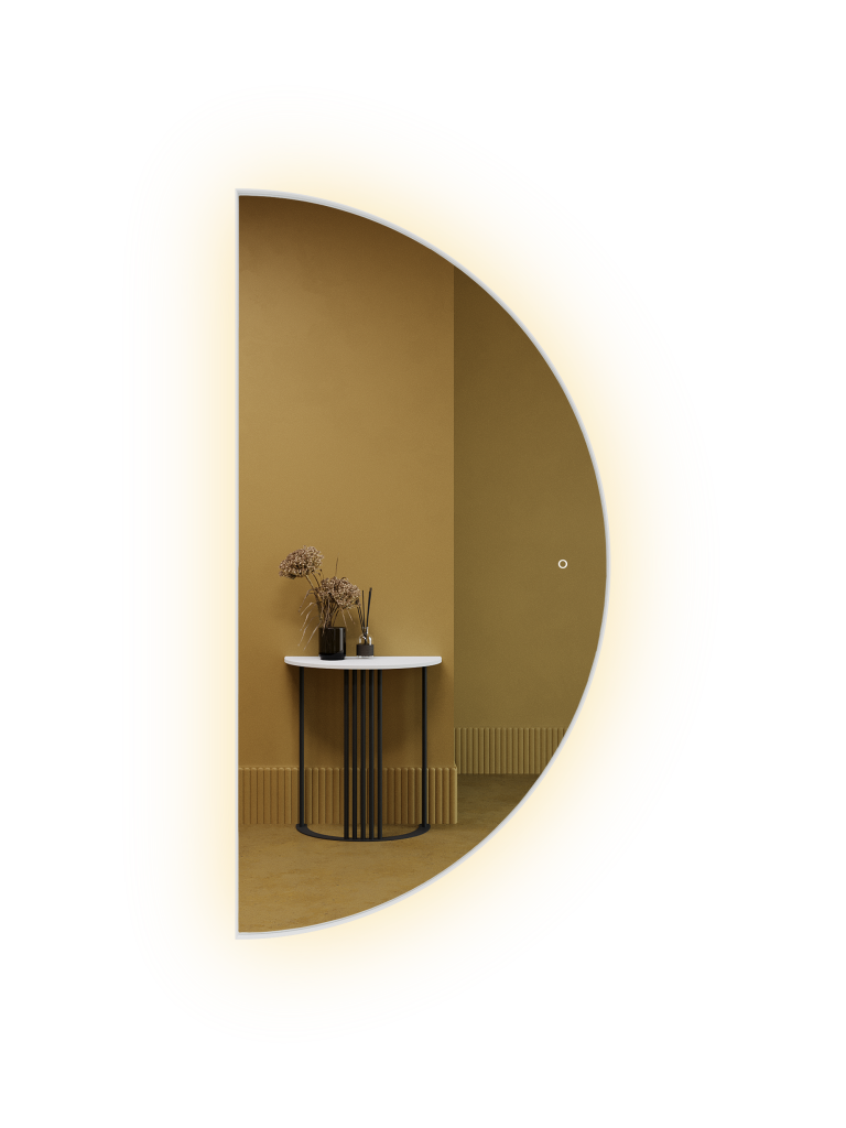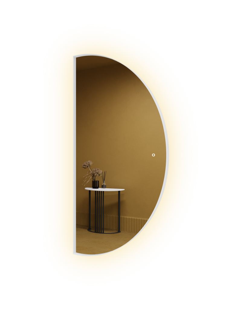 Дизайнерское настенное зеркало RONTUS M LED в форме полукруга, выполненное в стильной металлической раме с инновационной подсветкой 3 в 1 и сенсорной кнопкой управления. Его элегантная и нестандартная форма, а также сбалансированные размеры делают это зеркало универсальным элементом интерьера, подходящим для любых помещений загородного дома или квартиры.