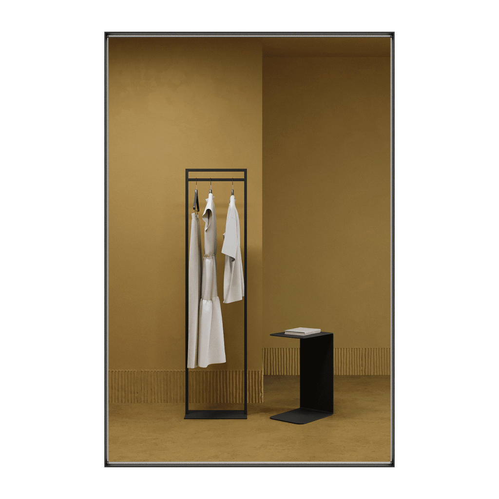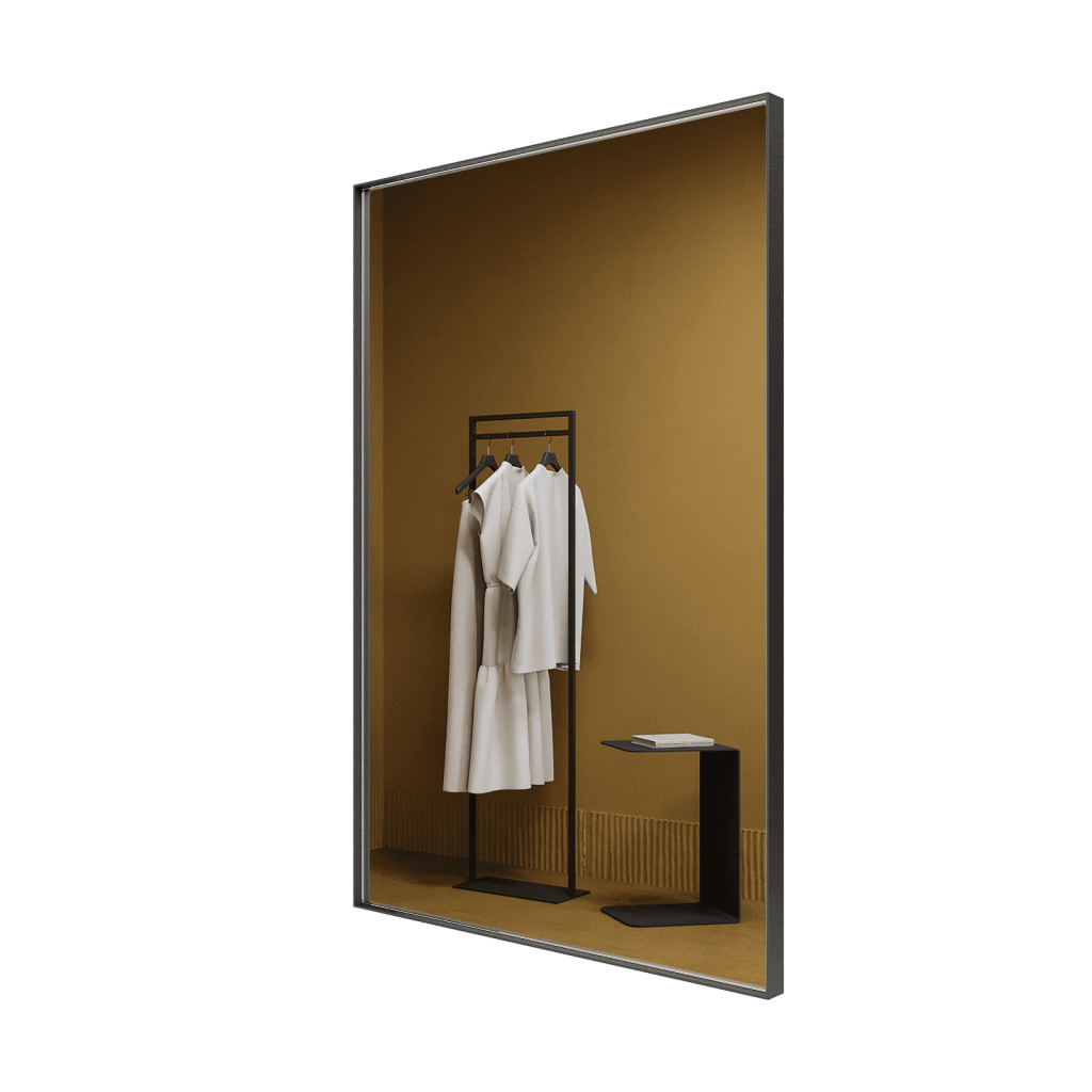 Большое прямоугольное зеркало HALFEO в тонкой металлической раме ручной работы. Зеркало в полный рост может быть как настенным, так и напольным. Производится как стандартно в тонкой раме 0.4*4 см с выступом рамы 1.5 см, так и в толстой раме 2*2 см. На тыльной стороне рамы присутствуют отверстия для монтажа на стену. Также зеркало можно просто облокотить об стену и поставить его под удобным углом наклона.