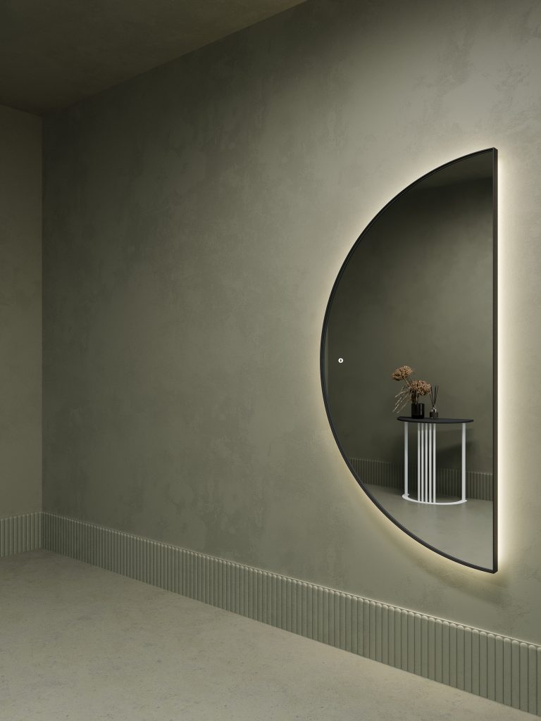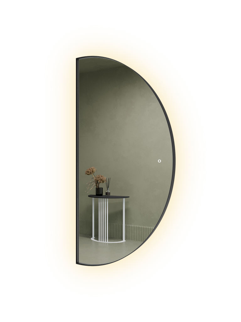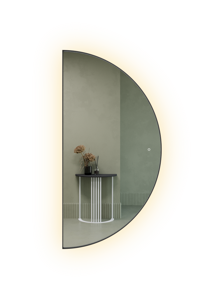 Дизайнерское настенное зеркало RONTUS M LED в форме полукруга, выполненное в стильной металлической раме с инновационной подсветкой 3 в 1 и сенсорной кнопкой управления. Его элегантная и нестандартная форма, а также сбалансированные размеры делают это зеркало универсальным элементом интерьера, подходящим для любых помещений загородного дома или квартиры.