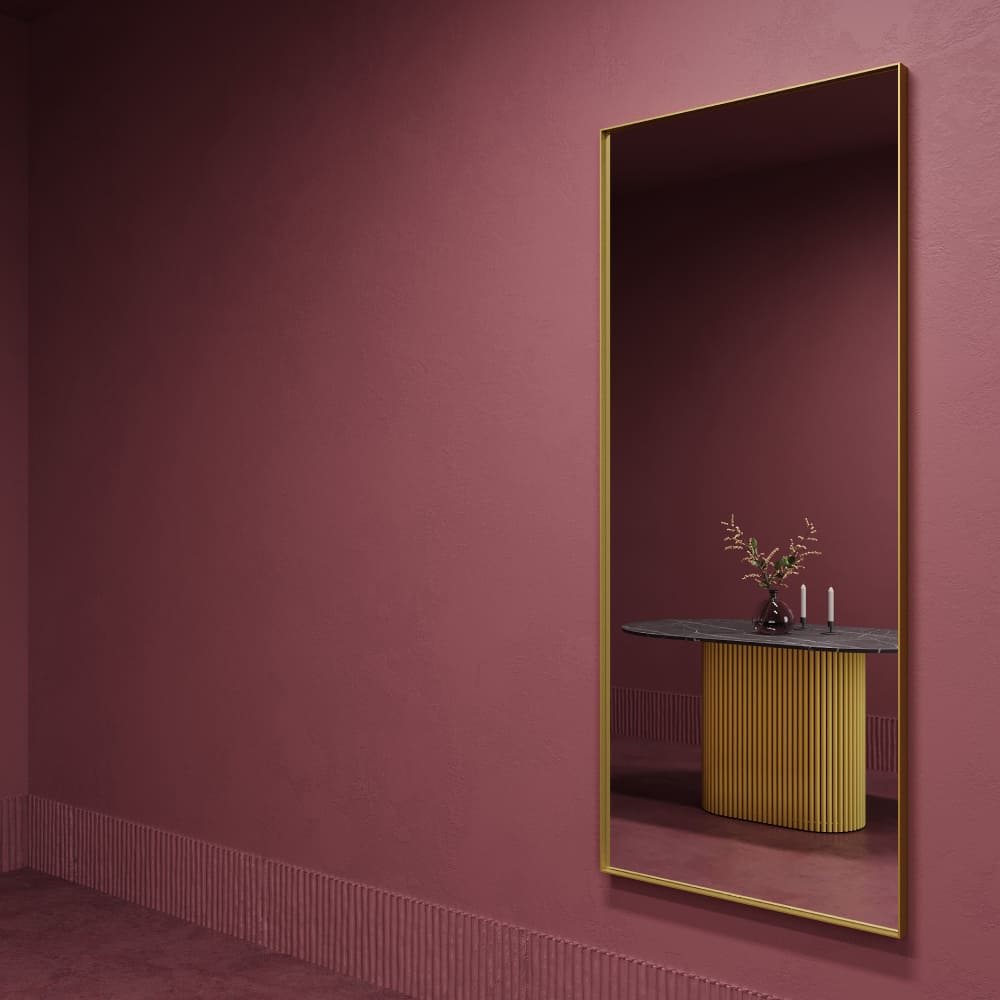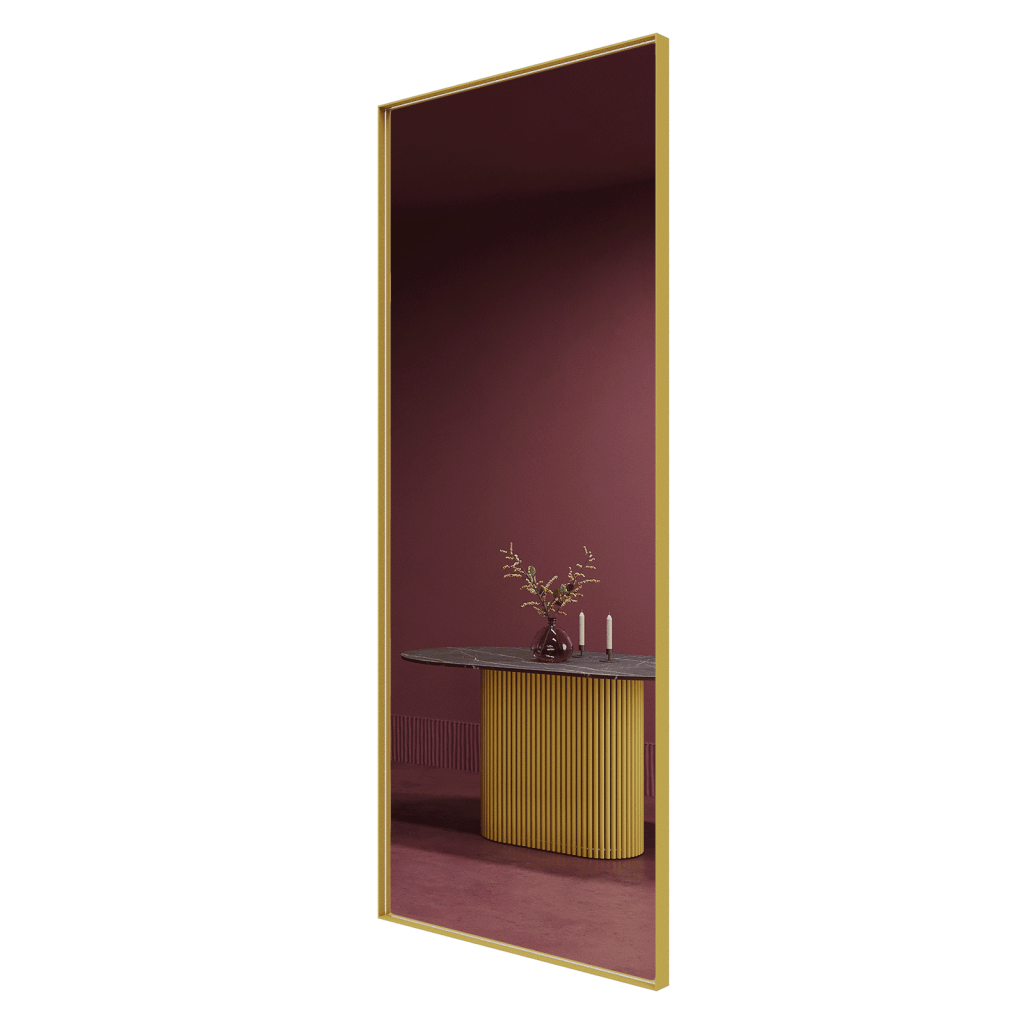 Большое прямоугольное зеркало HALFEO в тонкой металлической раме ручной работы. Зеркало в полный рост может быть как настенным, так и напольным. Производится как стандартно в тонкой раме 0.4*4 см с выступом рамы 1.5 см, так и в толстой раме 2*2 см. На тыльной стороне рамы присутствуют отверстия для монтажа на стену. Также зеркало можно просто облокотить об стену и поставить его под удобным углом наклона.