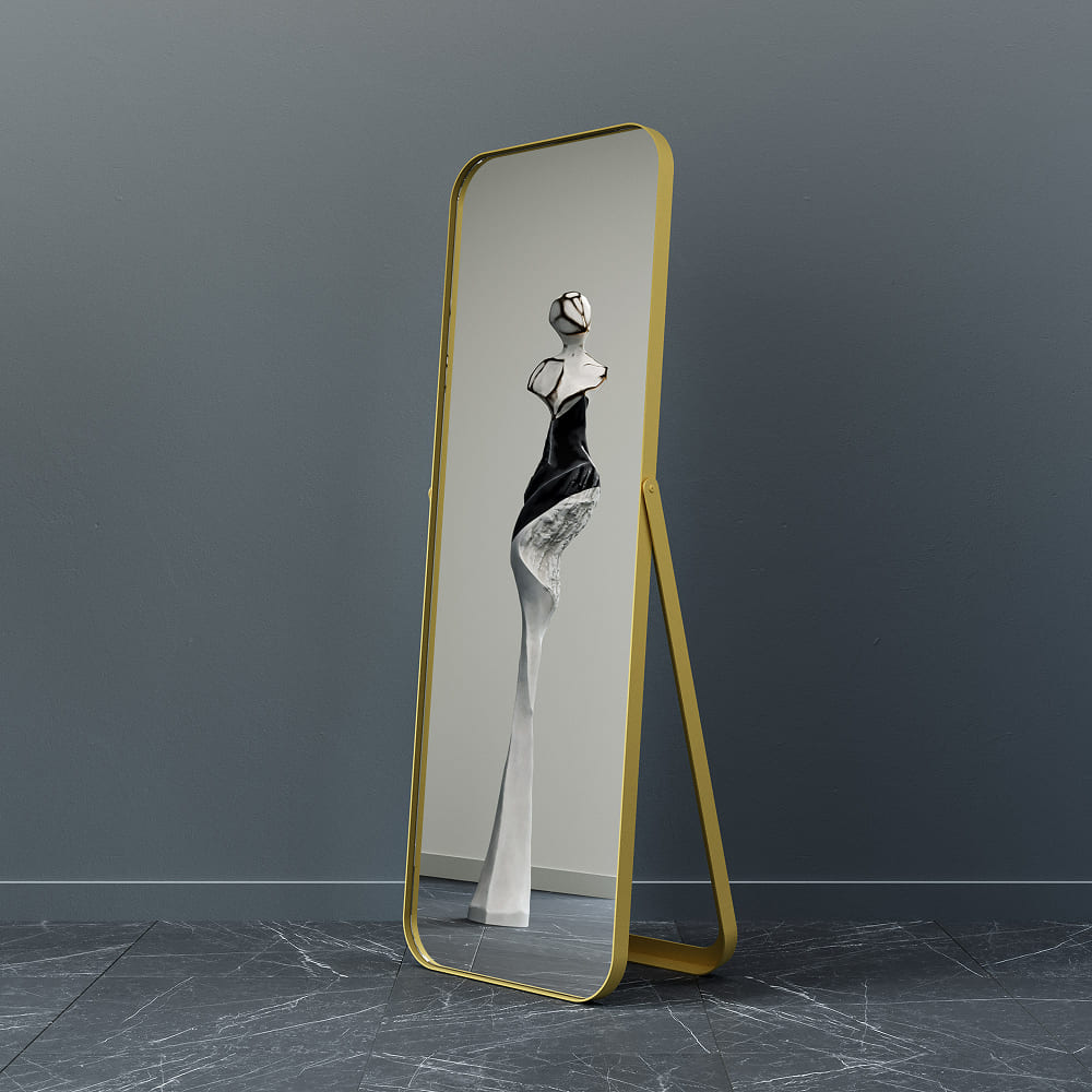 Интерьерное дизайнерское зеркало с регулируемым наклоном в прямоугольной металлической раме с закруглёнными углами станет отличным акцентом вашего интерьера и подчеркнет стиль вашего дома. Изготовленное вручную, это зеркало обладает уникальным характером и вниманием к деталям, что делает его настоящим произведением искусства. Одной из ключевых особенностей этого зеркала является регулируемый угол наклона опоры, который позволяет вам фиксировать его в наиболее удобном для вас положении.