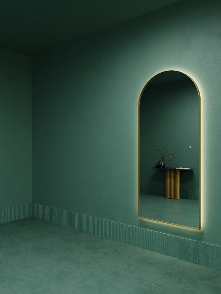 Наши настенные/напольные зеркала арочной формы, ARKIS L LED с контурной (тыльной) подсветкой – это истинные произведения интерьерного искусства. Элегантное дизайнерское зеркало в тонкой металлической раме станет прекрасным акцентом в вашем интерьере. Производится стандартно в тонкой раме 0.4 х 4 см с выступом рамы 1.5 см. Габаритные размеры зеркала составляют 180 х 80 см.